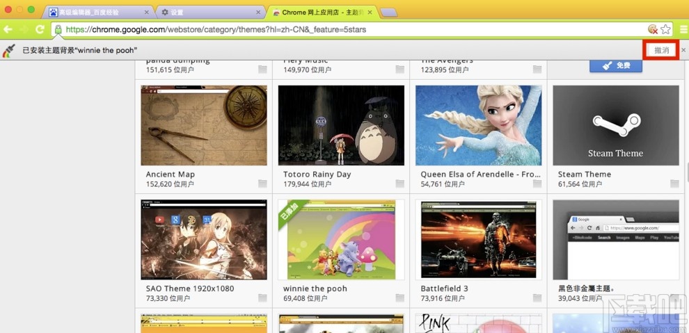 6.点击之后就会成功将浏览器主题背景设置为选择的这一个背景了,在背景选项中也会显示已安装,如果想要取消使用点击右上角的撤销按钮即可。