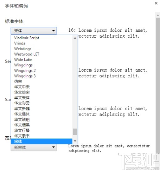 5.点击这个自定义字体按钮之后来到选择字体的界面,我们在界面中点击标准字体下方的下拉列表,然后根据自己的需求来选择想要更改的字体选项即可。