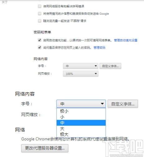 4.点击显示高级设置界面之后,我们在网络内容这个模块中可以看到字号设置选项,找到之后点击下拉列表选择字体的字号,再点击自定义字体按钮。