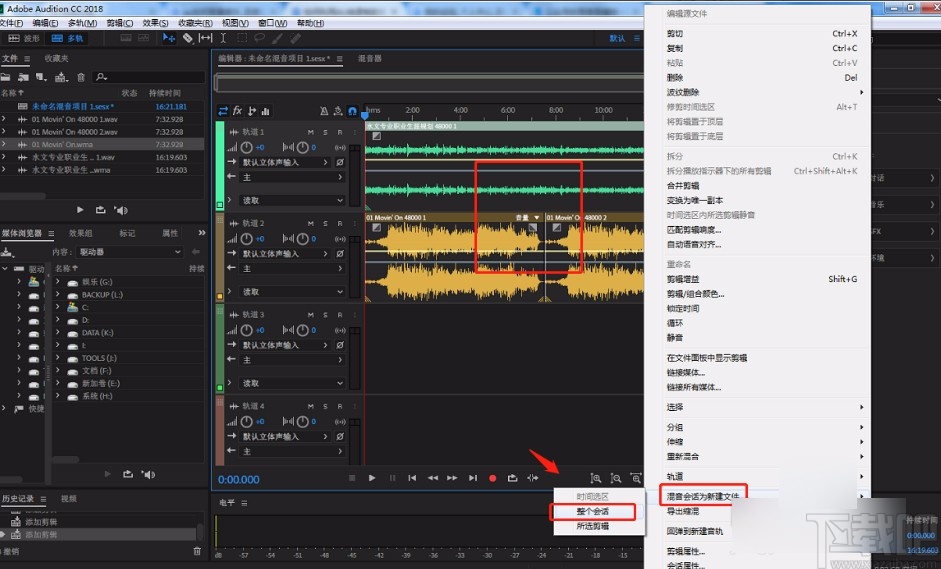 5.然后我们按住键盘上的“Ctrl”键,并使用鼠标选中轨道上的所有音频文件,这时点击鼠标右键,界面上会出现一个下拉框,我们在下拉框中选择“整个会话”,并在子下拉框中选择“混音会话为新建文件”。