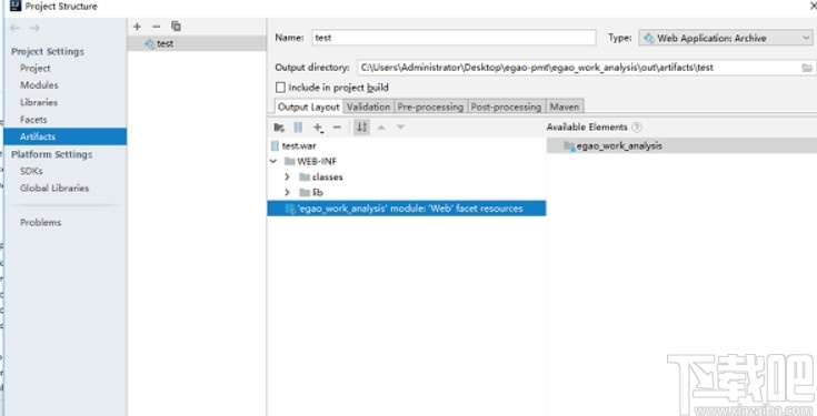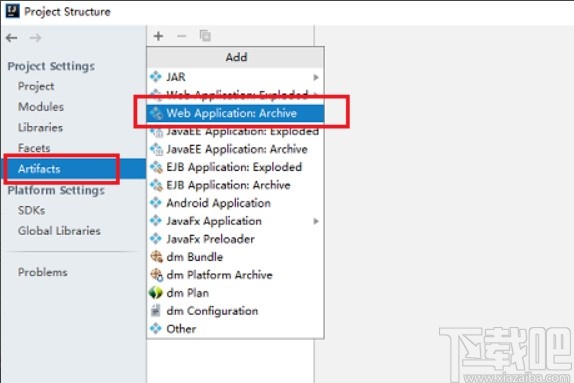 1.首先第一步我们打开软件之后,按下快捷键Ctrl+Alt+shift+s,然后打开Project Structure这个界面,选择左边Artifacts选项子菜单中的Web Application Archive这个选项。