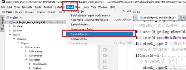 4.进入到下一个步骤之后,我们点击上方的Build这个选项,在打开的菜单中选择Build Artifacts这个选项,进行项目打包成war的操作。