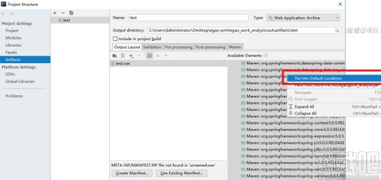 2.之后下一步我们就可以在进入到的界面中修改打包的war包名称和存放它的路径,也可以使用默认路径,将右侧的选项全选之后右键点击,选择Put into Output Root选项。