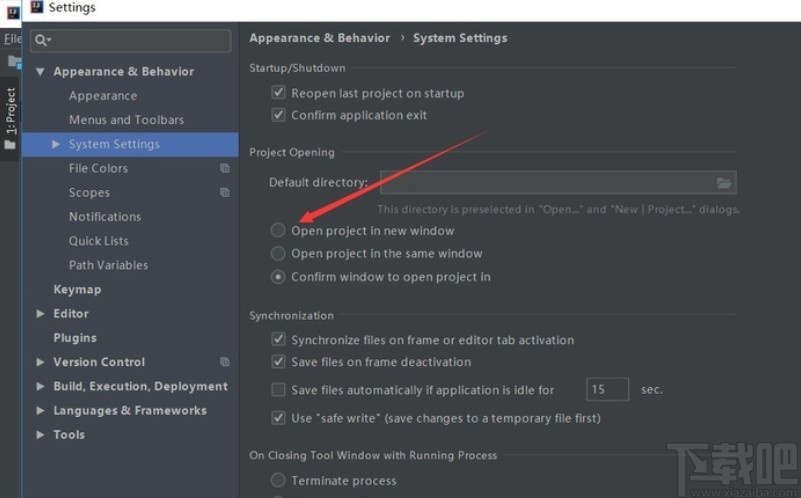 5.在系统设置界面右边的模块中,我们可以看到有“Open project in new window”这个选项,勾选这个选项之后进行下一步操作。