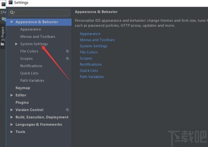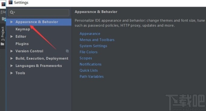 3.进入到这个设置界面之后在设置界面的左上角找到“Appearance & Behavior”这个选项并点击,找不到的用户可以直接在左上角搜索这个选项。