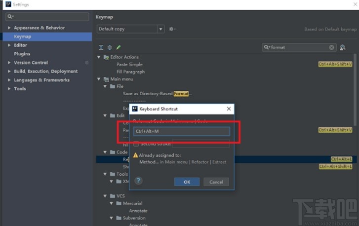 6.打开这个快捷键的设置界面之后,根据自己的需求来设置想要用来格式化代码的快捷键即可,点击OK按钮保存,比如小编设置快捷键为Ctrl+Alt+M,这样使用这个快捷键就可以进行代码的格式化。