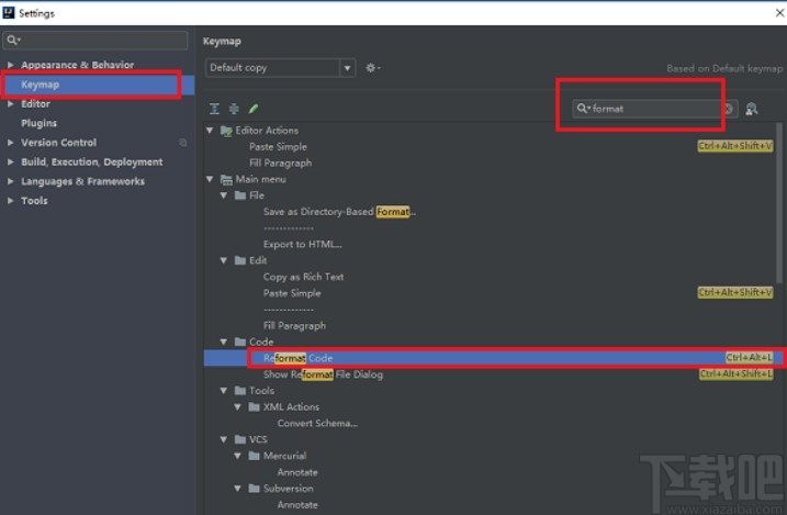 4.打开设置界面之后,在Keymap选项中就可以找到格式化代码的设置选项了,可以搜索格式单词format选项,找到格式化代码的操作之后,修改他的快捷键。