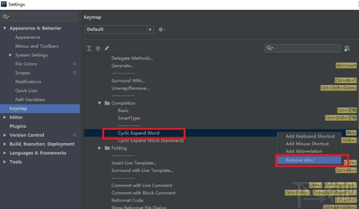 3.之后我们找到代码提示这个功能选项,可以看到代码提示的操作快捷键,使用右键点击之后可以选择Remove这个选项移除当前设置的快捷键。