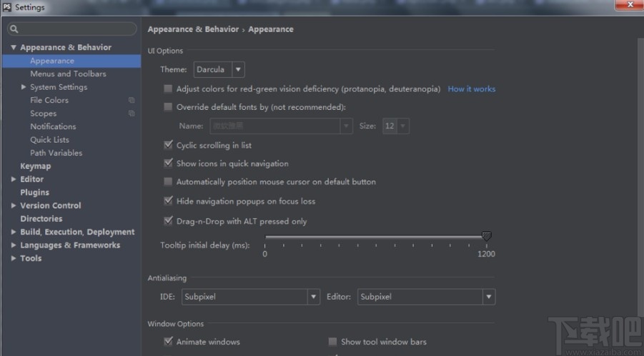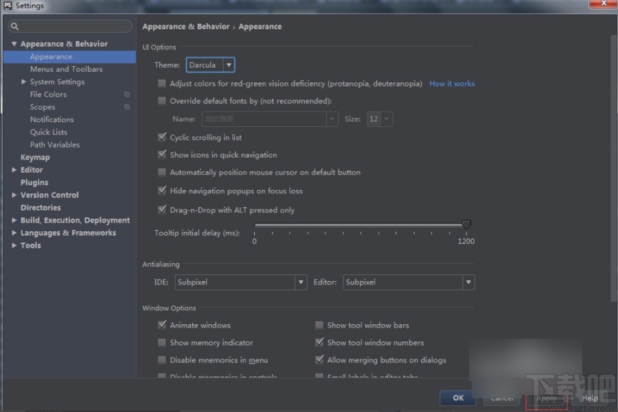 3.然后界面上就会弹出一个Settings窗口,我们在窗口左侧找到“Appearance&Behavior”选项,点击该选项,并在其下拉列表中选择“Appearance”选项。