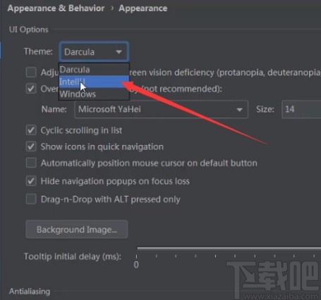 4.接下来我们在窗口上方找到“Theme”选项,该选项后面有一个下拉按钮,点击该选项,并根据自己的需要在下拉框中选择背景颜色。