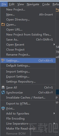 2.接着我们在“File”选项的下拉框中可以看到很多的操作选项,在这些选项中找到“Settings”选项。