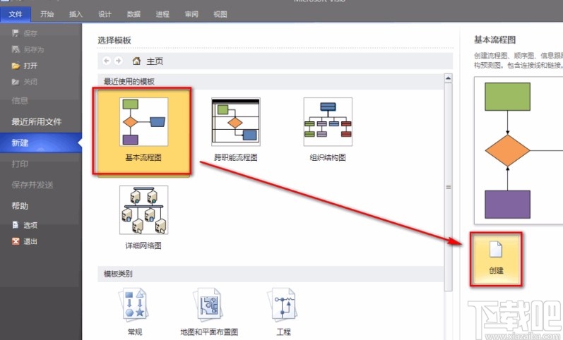 2.接着根据自己的需要在界面上选择一种流程图模板,并点击界面右侧的“创建”按钮,再进行下一步操作。