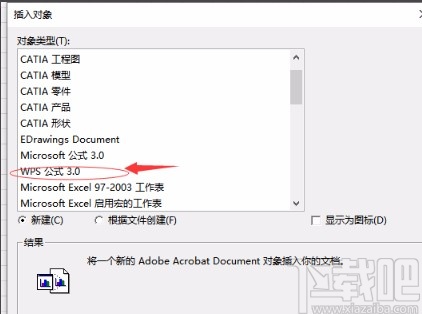 3.然后界面上就会出现一个插入对象窗口,我们在窗口的对象类型框中找到“WPS公式”选项,点击该选项即可。