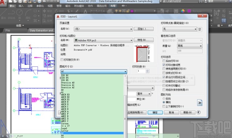 4.选择打印机之后,下一步我们在图纸尺寸位置打开下拉列表,将尺寸选择为最大的尺寸,如下图中所示。