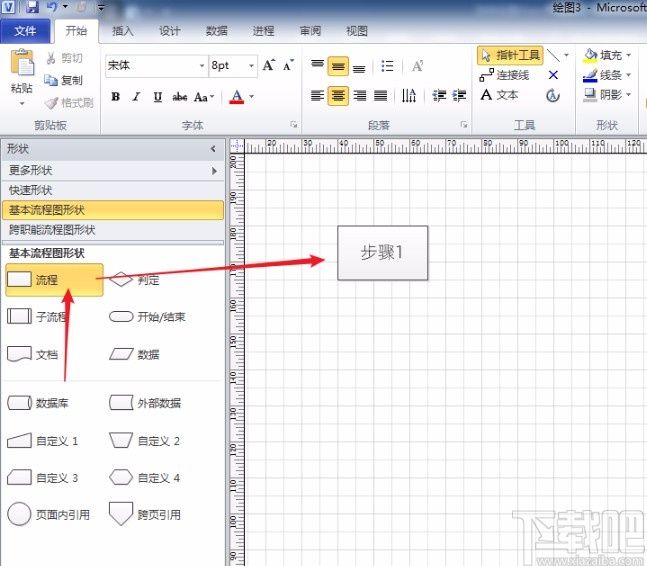 2.接着我们在界面左侧根据自己的需要选择基本流程图形状,将其拖动到页面中,就可以得到方框流程。
