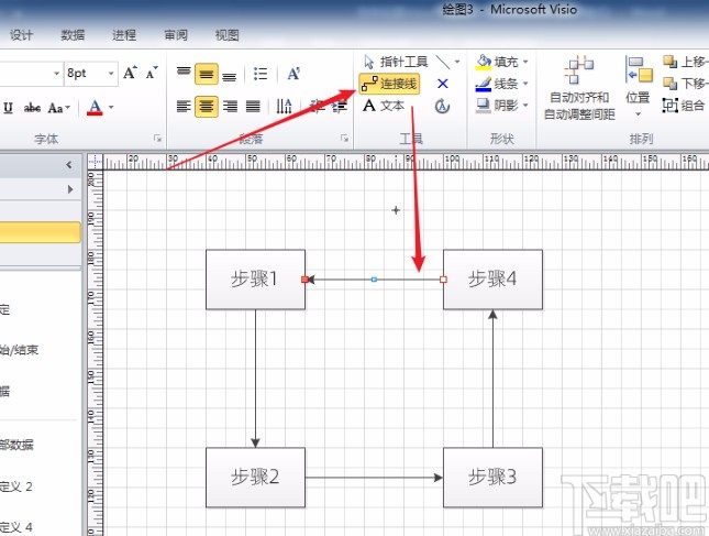 4.然后我们在界面上方找到“连接线”选项,点击该选项,在各个方框间绘制连接线,如下图所示。