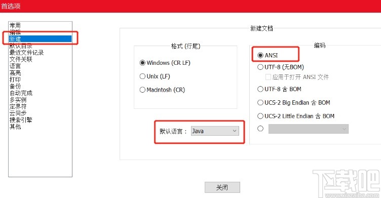 2.点击进入到首选项设置界面之后,我们选择左边的新建选项,然后在新建设置模块,编码的位置选择默认编码和默认语言,如下图中所示。