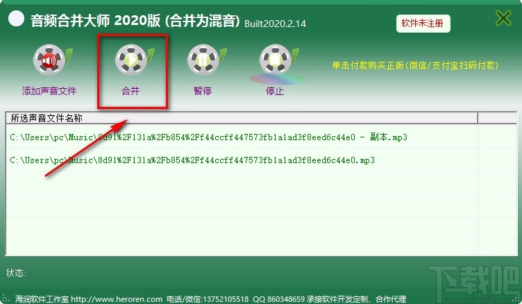 3.将音频文件添加到软件后,我们在界面上方找到“合并”选项,点击该选项就可以开始合并音频的操作。