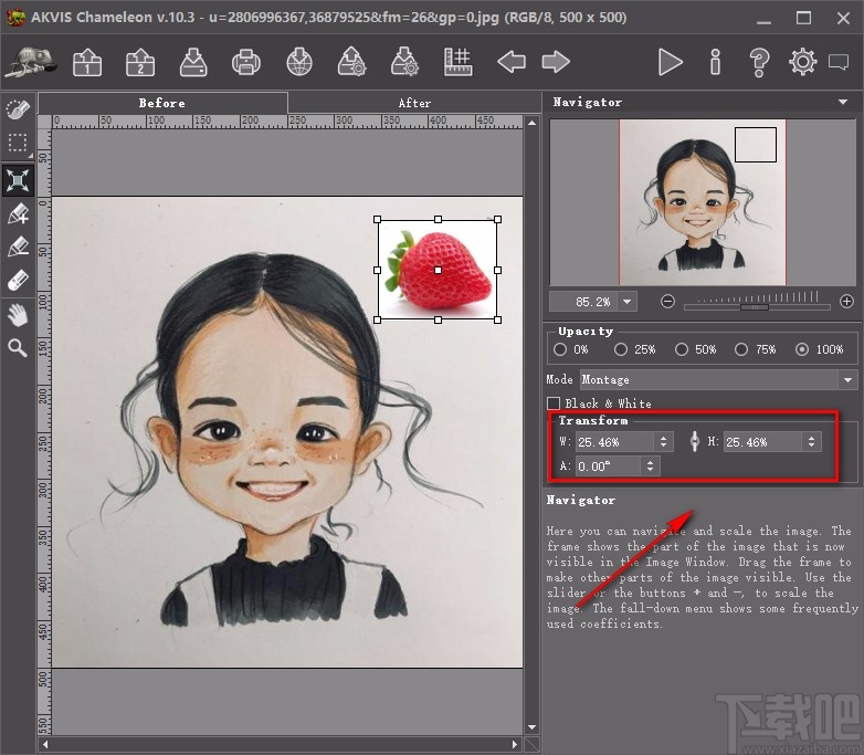 7.此外,我们在界面右侧还可以找到“Transform”选项,可以在该选项下方对图片的高度、宽度、角度等参数进行设置。