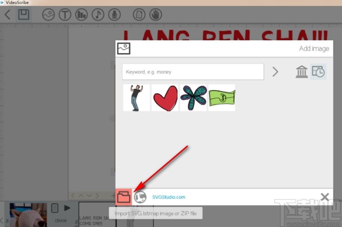 5.之后我们打开videoscribe软件,点击添加图片按钮之后,点击窗口中左下角的文件夹图标,如下图中所示。