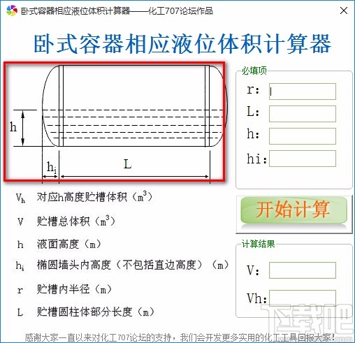 卧式容器相应液位体积计算器是一款非常简单实用的卧式容器相应液位体积计算软件,该软件体积小巧、界面简单,可以帮助建筑人员计算出贮槽总体积以及对应液面高度贮槽体积,操作起来十分便捷。这款软件虽然专业性很强,但是在操作使用方面比较简单。我们将软件打开后,不仅可以在软件界面上查看到卧式容器对应的图形,还可以对图形上标注的每个符号进行了解。鉴于有的朋友不知道怎么使用这款软件,那么接下来小编就给大家详细介绍一下卧式容器相应液位体积计算器的使用方法,有需要的朋友可以看一看。