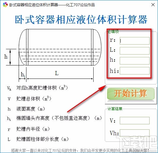 4.填好必填项后,我们在界面上可以找到“开始计算”按钮,点击该按钮就可以开始计算贮槽总体积以及对应液面高度贮槽体积了。