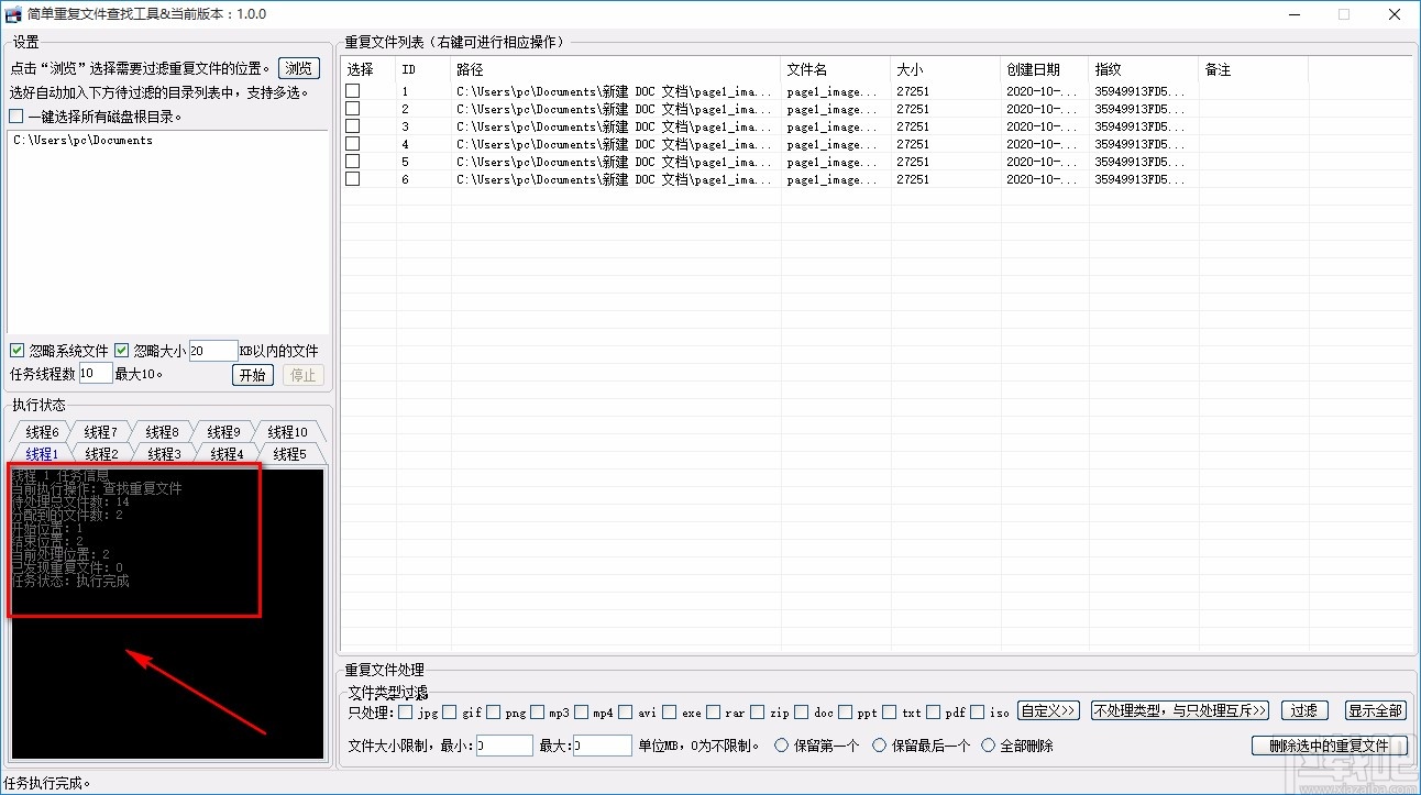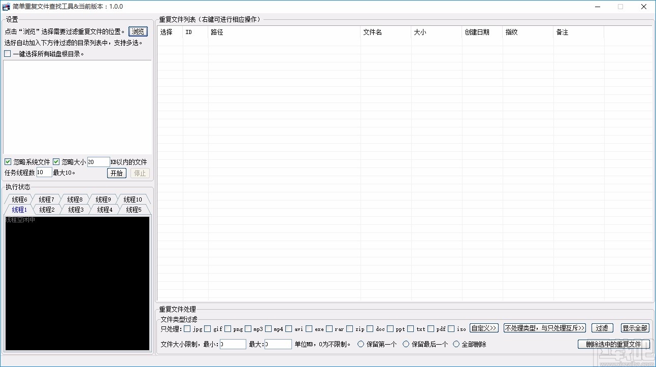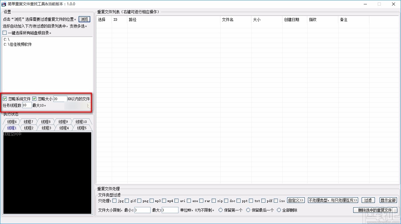 3.将位置选中后,我们在界面左侧可以看到“忽略系统文件”、“忽略大小多少KB以内的文件”、“任务线程数”等选项,这些选项都表示筛选文件的条件限制,我们根据自己的需要进行选择和设置就可以了。