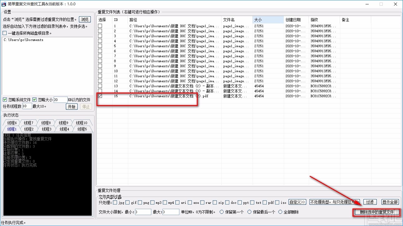 7.如果我们想要删除界面上显示的某些文件,则勾选这些文件,再点击界面右下角的“删除选中的重复文件”按钮,就可以将选中的文件删除了。