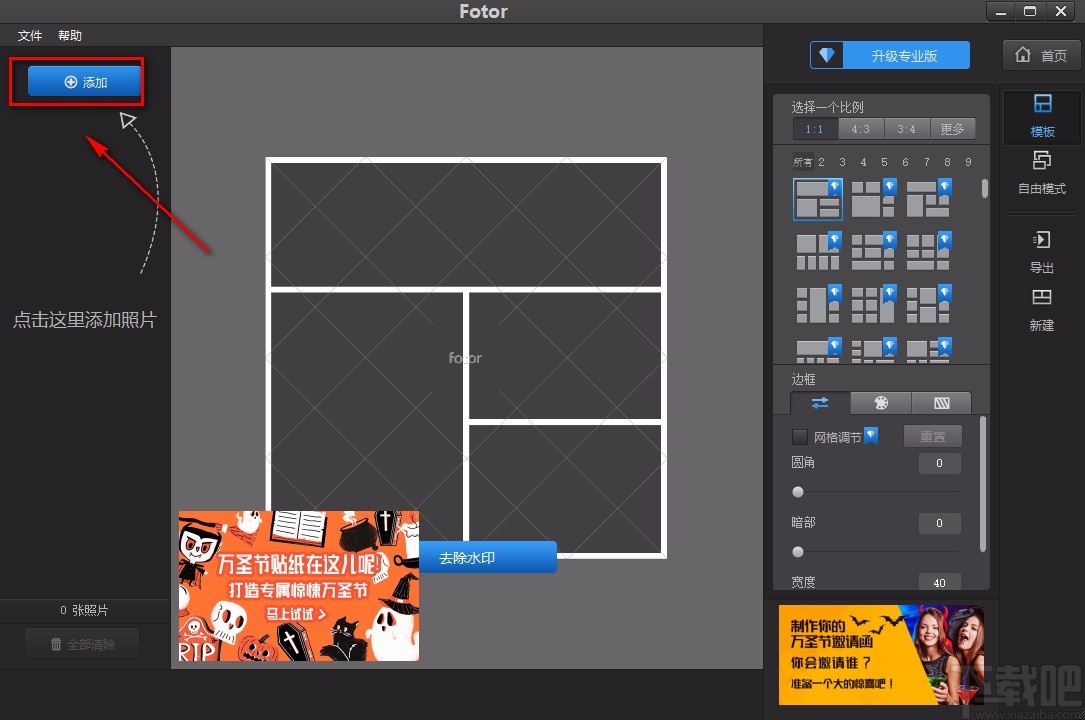 2.进入到拼图页面后,我们在界面左上角找到蓝色的“添加”按钮,点击该按钮进入到文件添加页面。