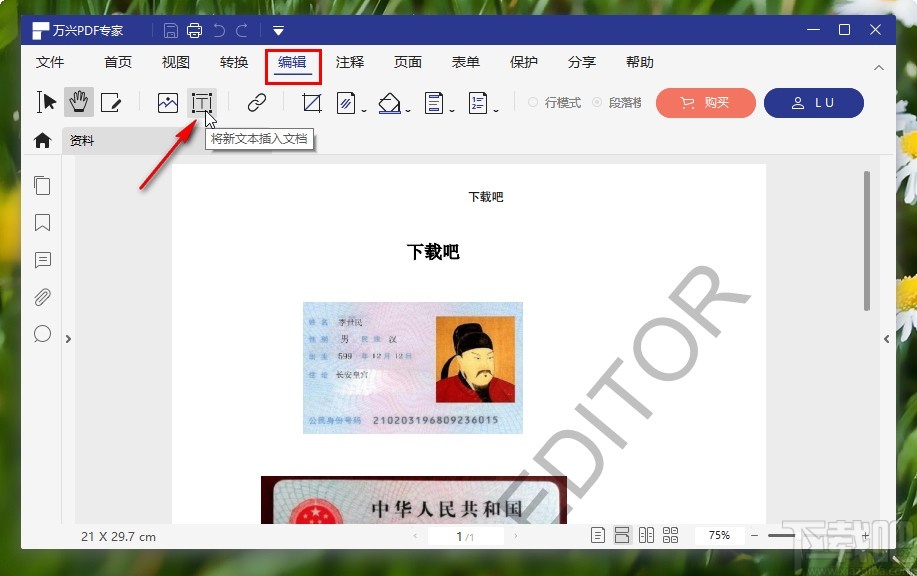 3.点击打开目标PDF文件之后,在界面上方点击编辑选项,然后在编辑界面中就可以看到有一个T字图标了,点击这个图标可以进入到文字编辑状态。