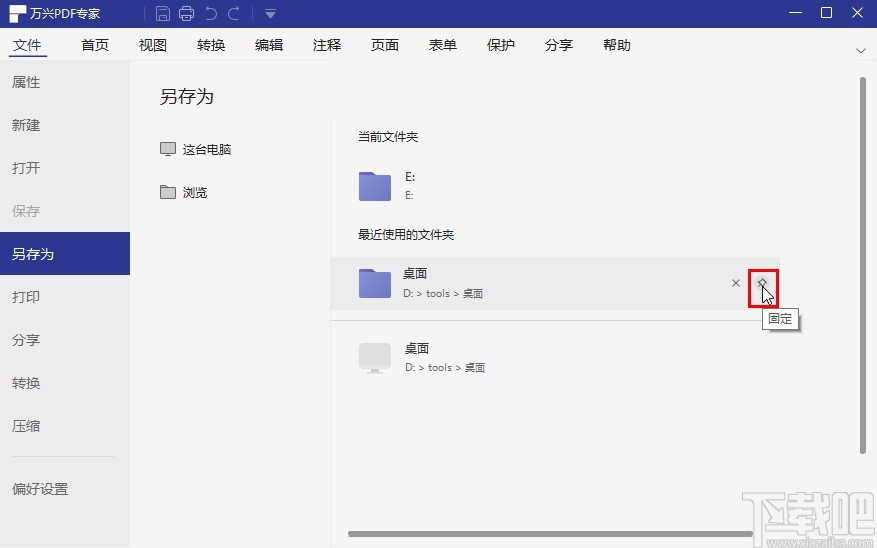 5.之后我们再次点击到另存为界面中,可以看到在右边最近使用的文件夹模块显示的是我们刚刚选择保存文件的那一个路径,然后我们点击它右边的固定选项。