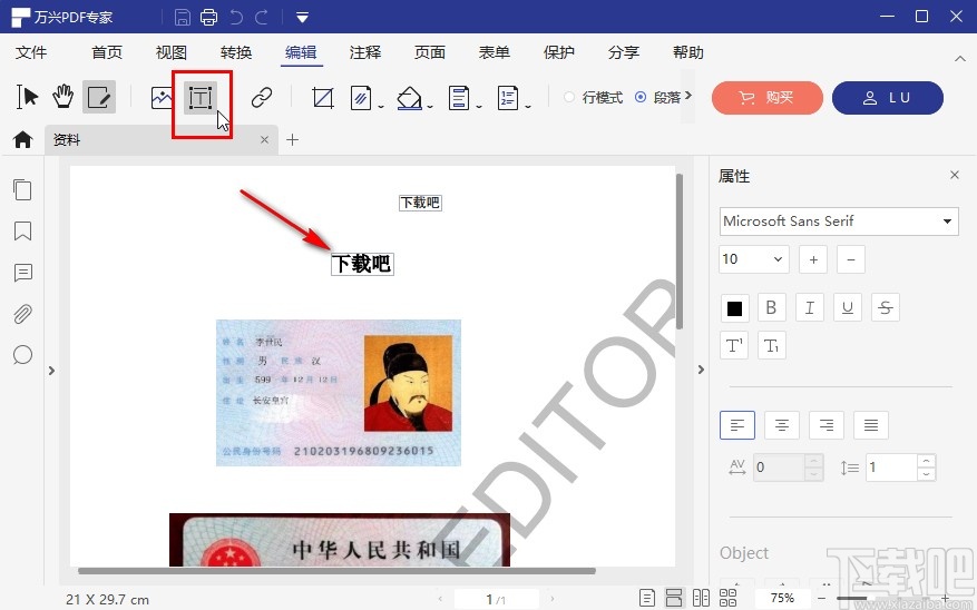 3.点击打开编辑界面之后,我们就可以在其中找到一个T字图标了,需要点击这个T字图标,然后让PDF文件中的文字切换成可以编辑状态。