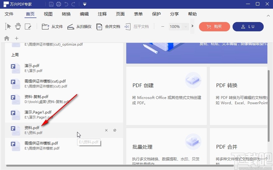 1.首先我们打开软件之后,在界面的最近使用中找到想要操作PDF文件点击打开,或者将目标PDF文件加载到软件中来。