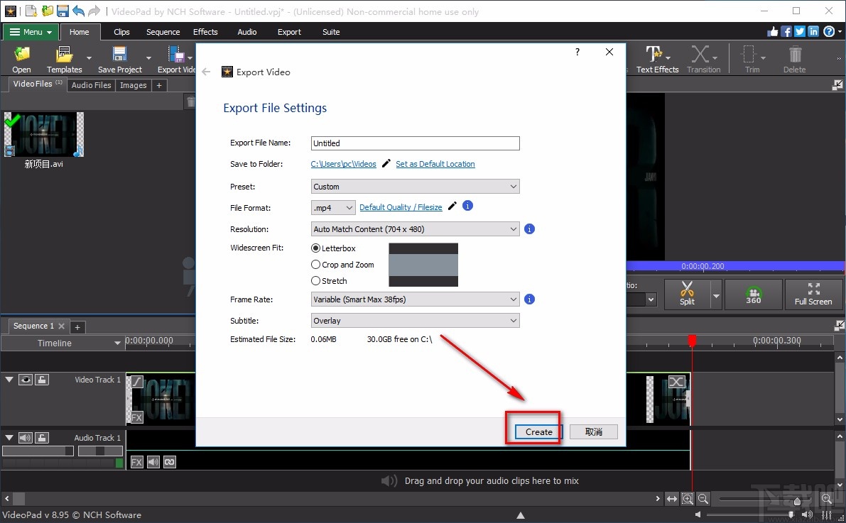9.完成以上所有步骤后,我们在窗口右下角找到“Create”按钮,点击该按钮就可以成功将视频导出软件了。