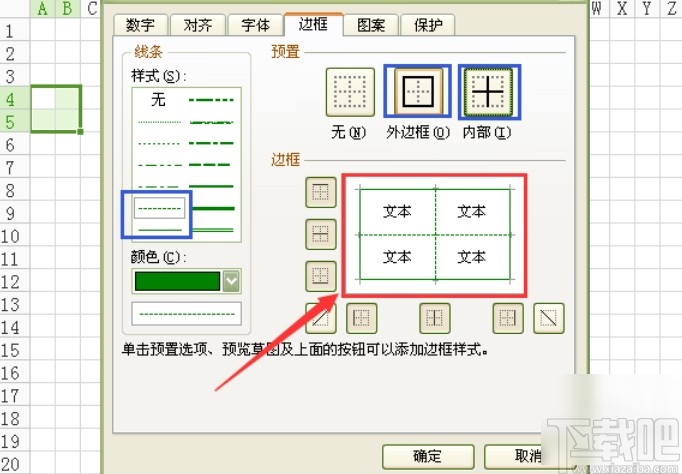 2.点击确定之后先制作一个田字格,选取A4:B5单元格,右键点击之后选择设置单元个格式,在出现的界面中,设置田字格内部的虚线,选择线条样式为虚线,点击确定按钮。