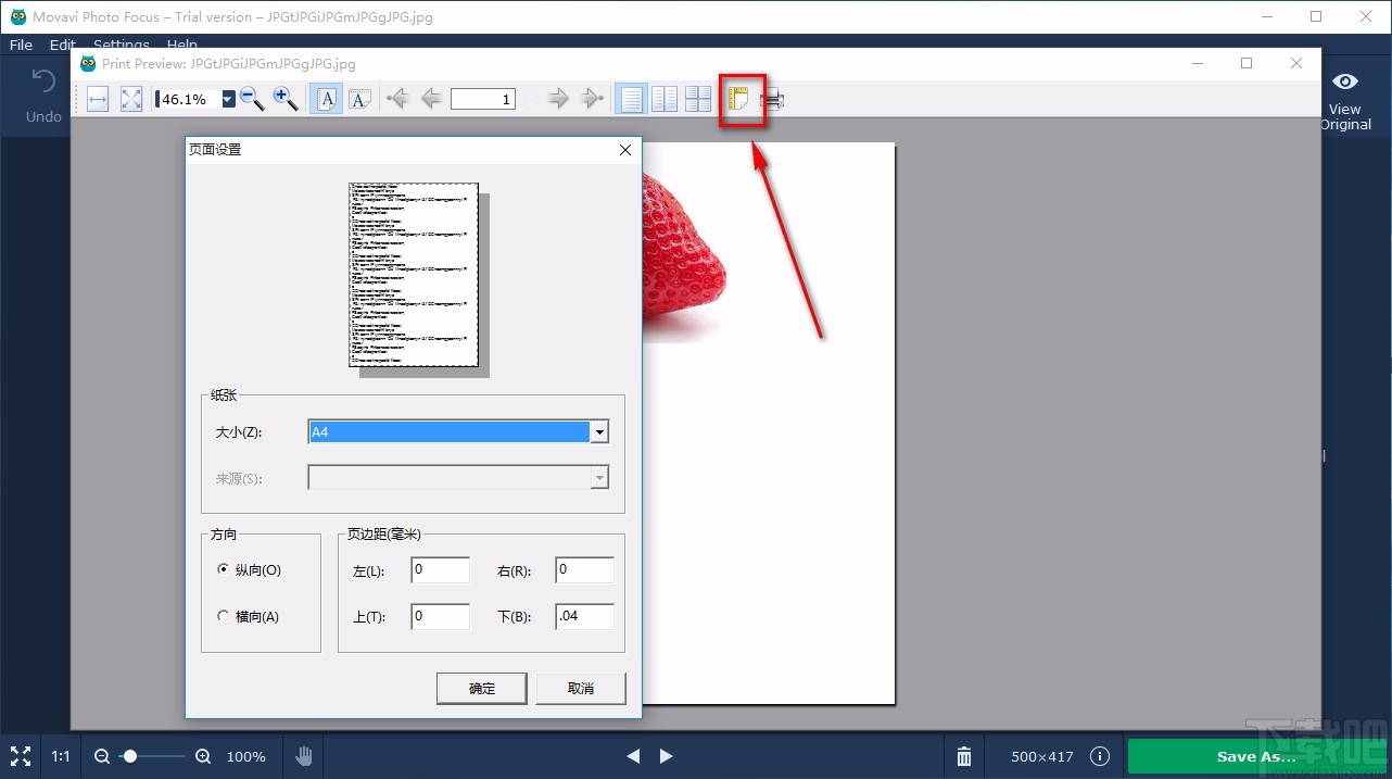 4.然后界面上就会弹出一个打印窗口,我们在窗口上方点击下图所示的按钮,就会有一个页面设置窗口出现在界面上。
