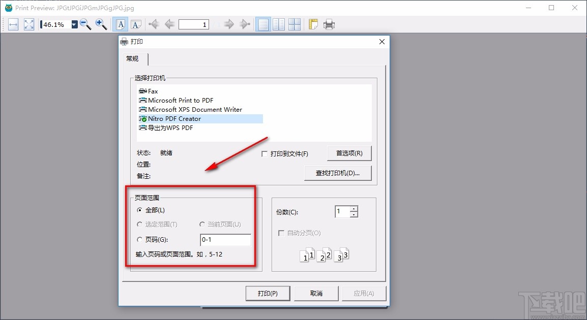 10.在对话框下方找到“页面范围”选项,根据自己的需要在该选项下方设置页面范围,如果选择“页码”,则还要在其后面的文本框中输入页码范围。
