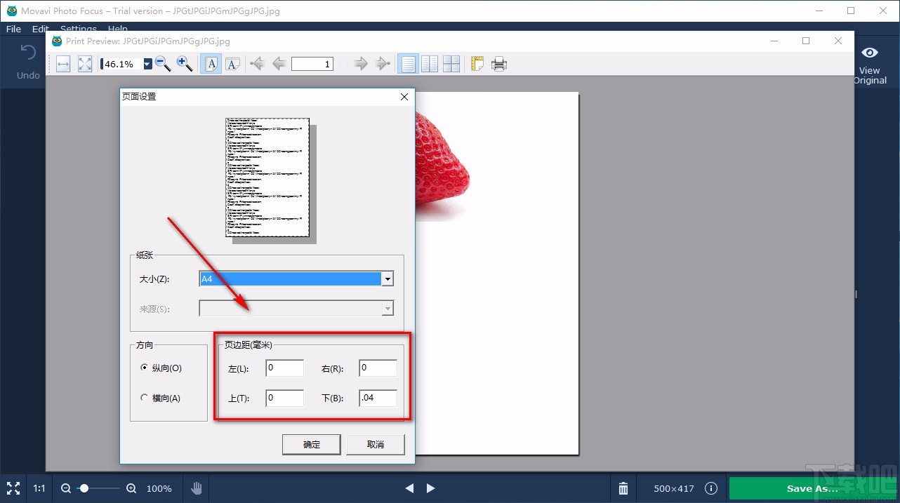 7.在窗口右下方还能找到“页边距”选项,我们分别在“左”、“右”、“上”、“下”选项后面的文本框中输入页边距,再点击“确定”按钮即可。