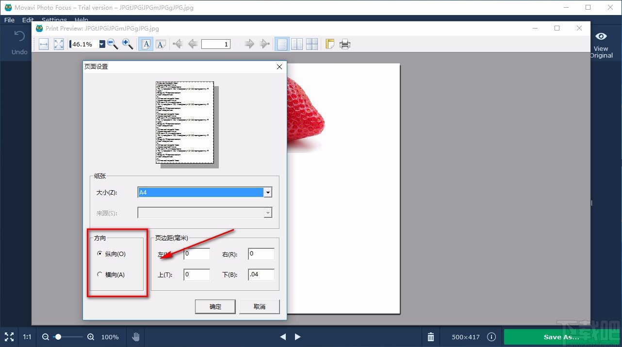 6.在窗口中还可以找到“方向”选项,我们根据自己的需要在其下方进行选择。