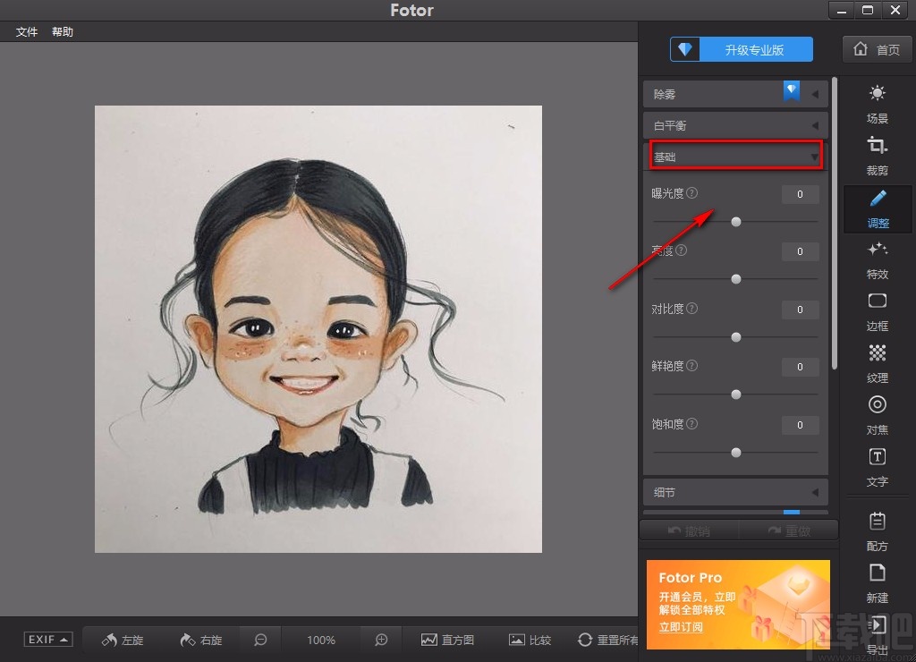 5.在调整面板中,我们找到“基础”选项,点击该选项,其下方会出现一个下拉列表。