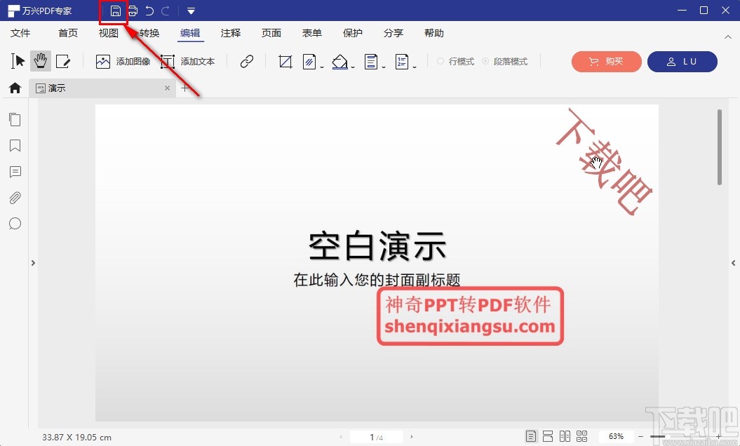 9.点击确定按钮之后回到软件的主界面,在主界面左上方找到保存图标之后,将这个添加水印之后的文件保存下来即可。