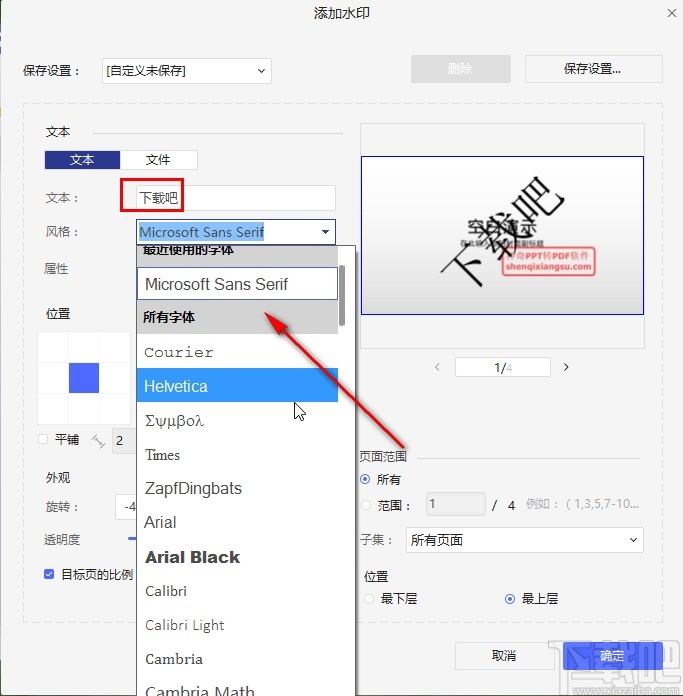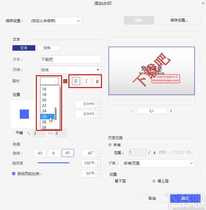 7.接下来就是需要对文字水印的位置和外观进行设置了,选择好合适的位置之后,可以设置旋转的角度和透明度。