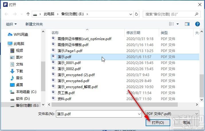 2.点击这个浏览按钮之后,打开选择文件的界面,在这个界面中我们根据自己的需求来选择想要添加文字水印的那一个PDF文件,选中之后点击打开按钮。
