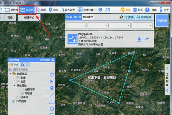 4.如果是需要选择不规则的区域的话我们可以选择多边形这个选项,然后自己点击选取地图中想要测距离的区域,可以是不固定形状的多边形,选择之后同样的在右上方的信息数据中就可以看到测算得到的面积数据了。