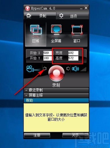 7.在界面上还可以找到“宽度”和“高度”两个选项,可以在两个选项后面的文本框中输入对应的数值,来设置录制框的大小。