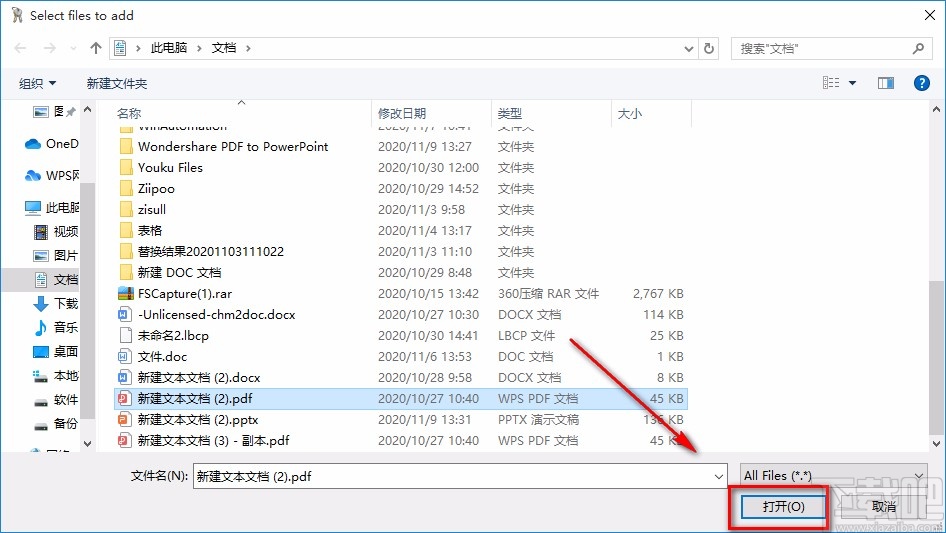 2.接着在文件添加页面中,我们选中需要加密的PDF文件后,再点击页面右下角的“打开”按钮即可。