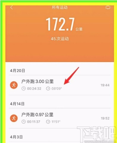 4.然后我们在界面上还可以看到以往的历史跑步数据,包括日期以及跑步的里程数;我们还可以点击某一条记录进入查看。