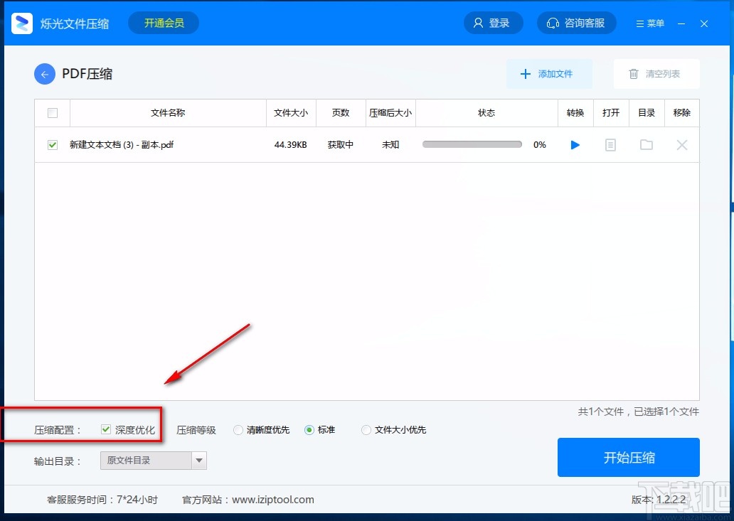 4.将PDF文件添加到软件后,我们在界面左下方找到“压缩配置”选项,该选项后面有一个“深度优化”选项,我们根据自己的需要决定是否勾选。