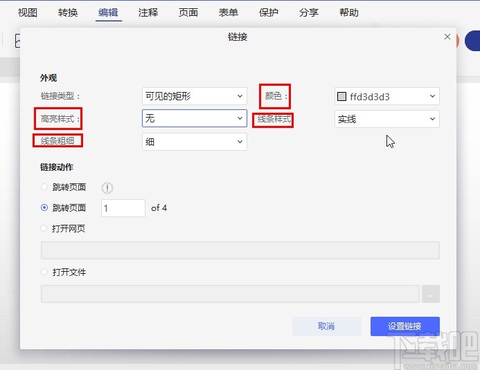 6.接下来下一步就可以对链接动作进行编辑了,选择跳转页面动作的话就需要在后方的输入框中输入想要跳转的页面页码,如下图中所示,小编输入3,就表示点击之后会跳转到第三页。