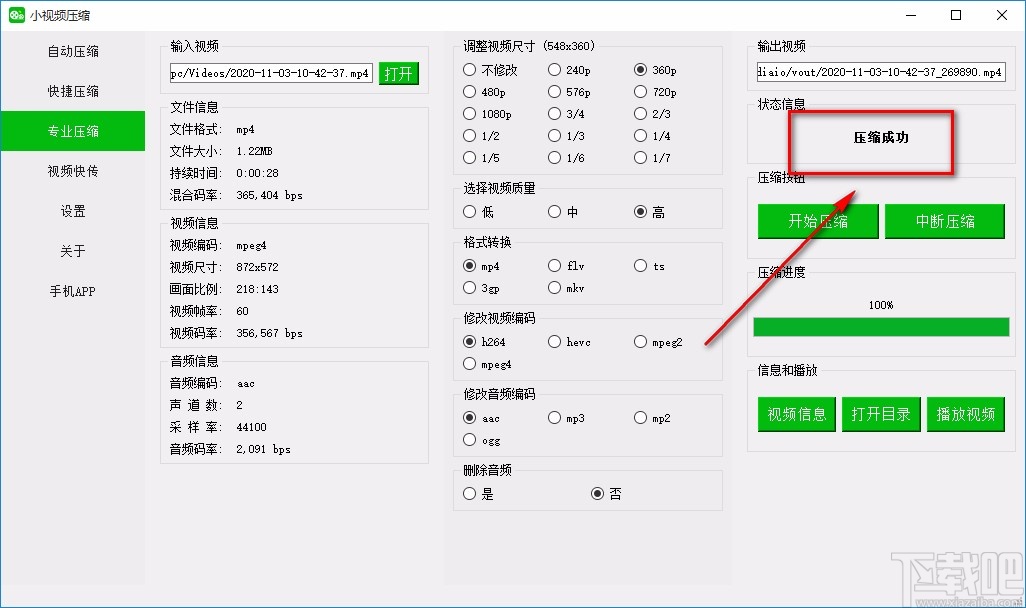 8.视频压缩的速度非常快,压缩完毕后,我们在界面右上方的“状态信息”栏中可以看到“压缩成功”的提示字样,如下图所示。
